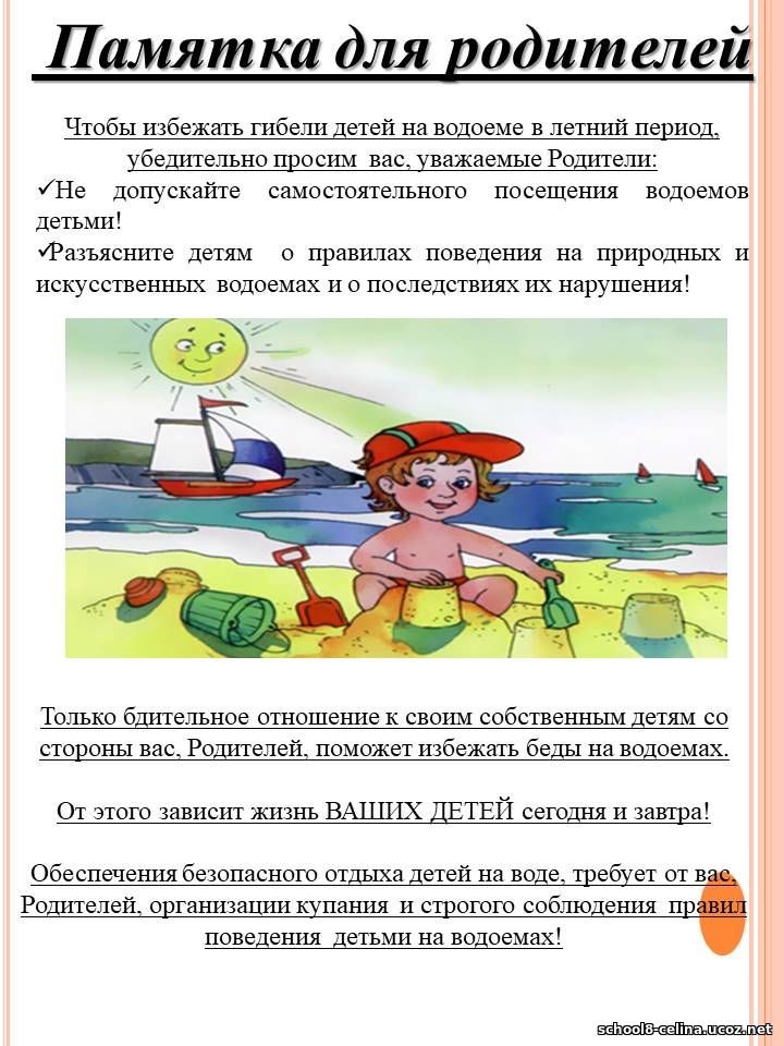 Напоминайте ребенку, что отдых и игры у водоемов (озера, реки, пруды и др.) кроме удовольствия несут еще и угрозу для жизни и здоровья ребенка.