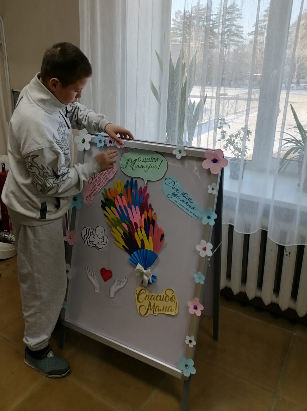 В отделении реабилитации несовершеннолетних с ограниченными физическими и умственными возможностями ГБУ АО «Белогорский КЦСОН», на десятидневных интенсивах, в преддверии Дня Матери, ребята вместе со специалистами подготовили и оформили праздничную выставку. Для этого сделали букет из цветной бумаги, вырезали и склеивали детали.